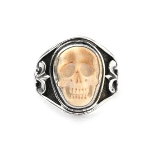 マンモスの牙の化石にスカルが彫刻されているSculpted Skull Ringはアクセサリー好きでも知られるジョニーデップも愛用しており、他にもアーノルド・シュワルツネッガーなど多くのハリウッドセレブから支持を得ているアクセサリーです。
