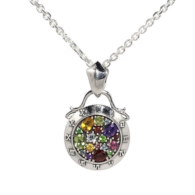 時計の中心に天然石を散りばめたラグジュアリーなペンダント。