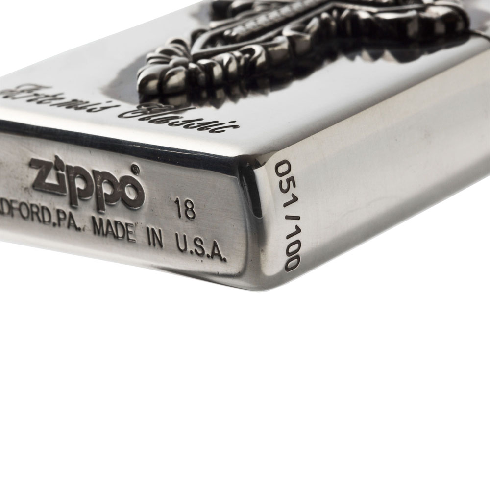立体のフローラルディバインペンダントとトレードマークのひし形Aが重厚なジッポーです。