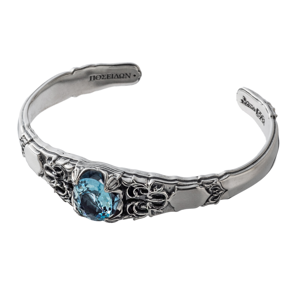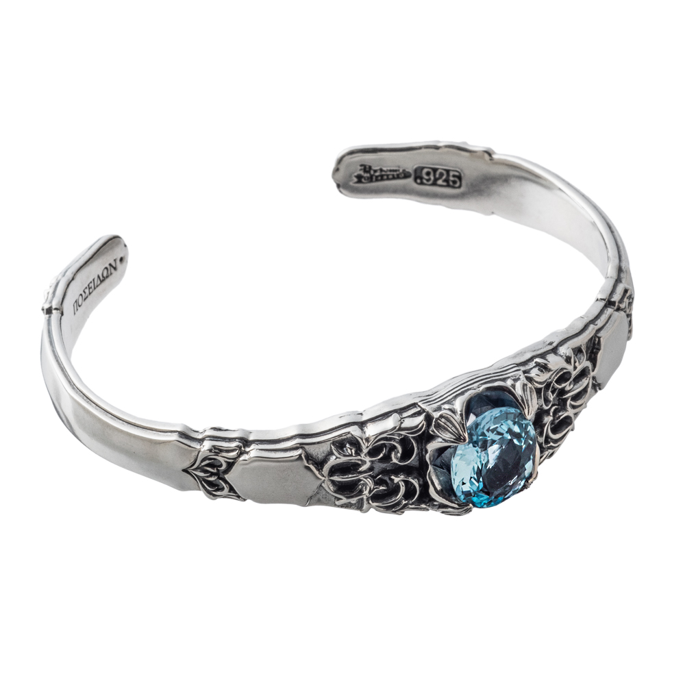 繊細なカッティングが施されたブルートパーズをセンターにセットしたシルバーバングル。