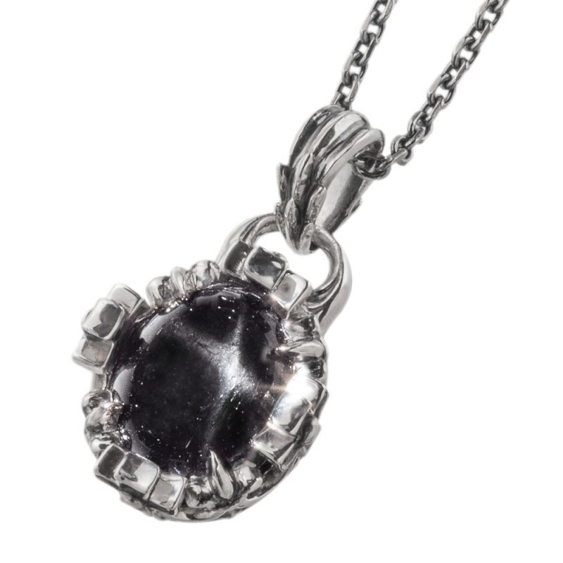 王冠型の台座に楕円のカボションカットのブラックスターがあしらわれたシルバーペンダントです。