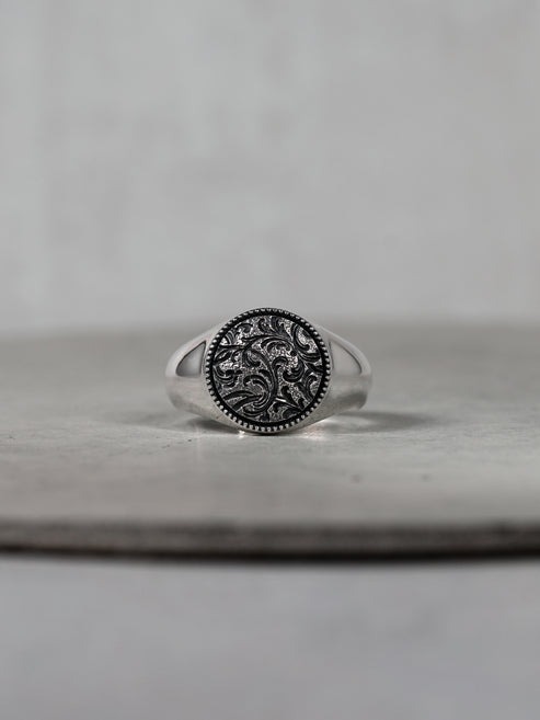 正面に唐草柄が彫刻されたラウンド型のシグネットリング(スモール)です。