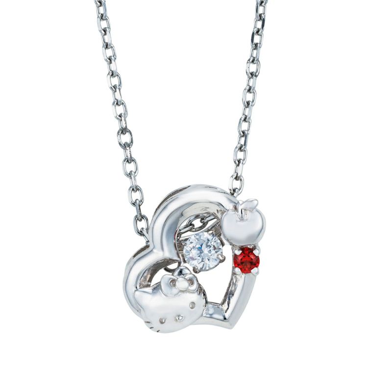 オープンハートにキティとりんごをデザインし、限定カラーのキュービックジルコニアを添えた可愛いデザイン♪