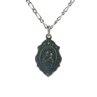 表面にはキリストを抱える聖ヨセフが、裏面には子供を見守る守護天使がデザインされたリバーシブルペンダント