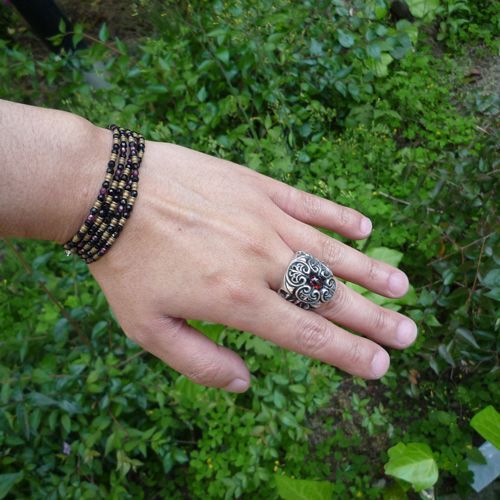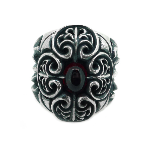 正面の繊細さと腕の部分の大胆なフレイム二つの面を持つヘビーなリング