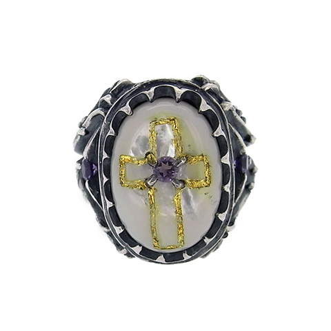 マザーオブパールの上にはアメジストの石留めが施されている。